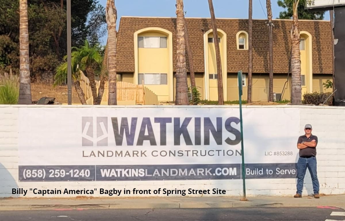 Our first article in this newsletter is written by Hayat Hakim, Estimator, on the Spring Street Apartment Building project award in La Mesa. Spring Street is one of several projects we have been awarded since the last newsletter. Spring Street will be our second project with the crew at GenProp Rising Sun, LLC. Thanks to Geoff Sherman, Oscar Iniguez, Belen Tillett, Felipe San Martin and Hayat Hakim for securing the award of the next Landmark project of La Mesa! One of our longest term employees Billy “Captain America” Bagby (seen in picture above), Senior Superintendent, took it upon him self to place our sign on the property before mobilization. We are set to mobilize in October of 2021!